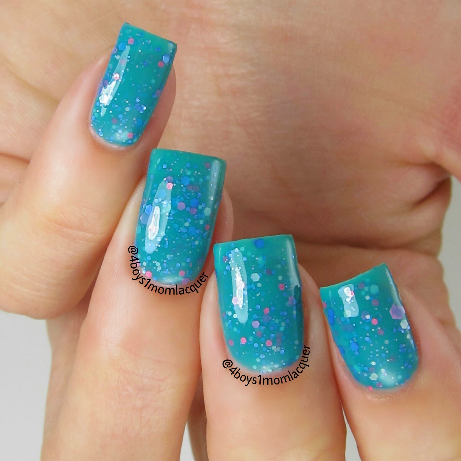 I applied 2 light coats and a top coat.This color is beautiful and I am OBSESSED with all the assorted shaped glitter.